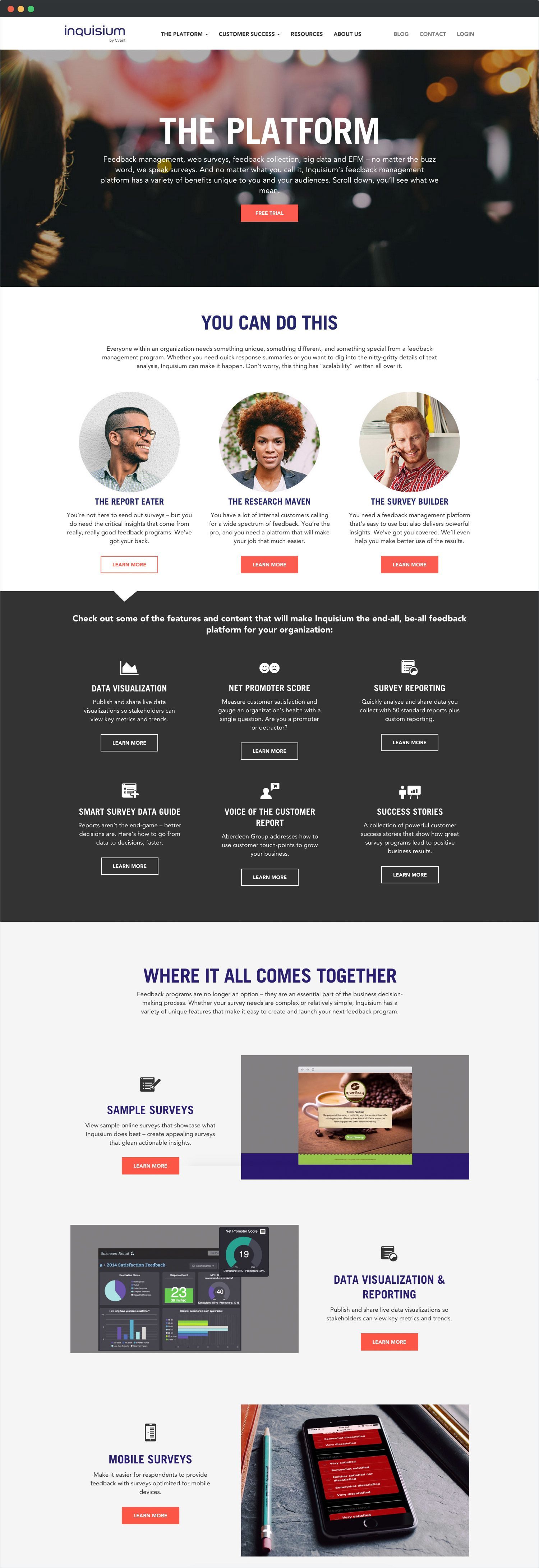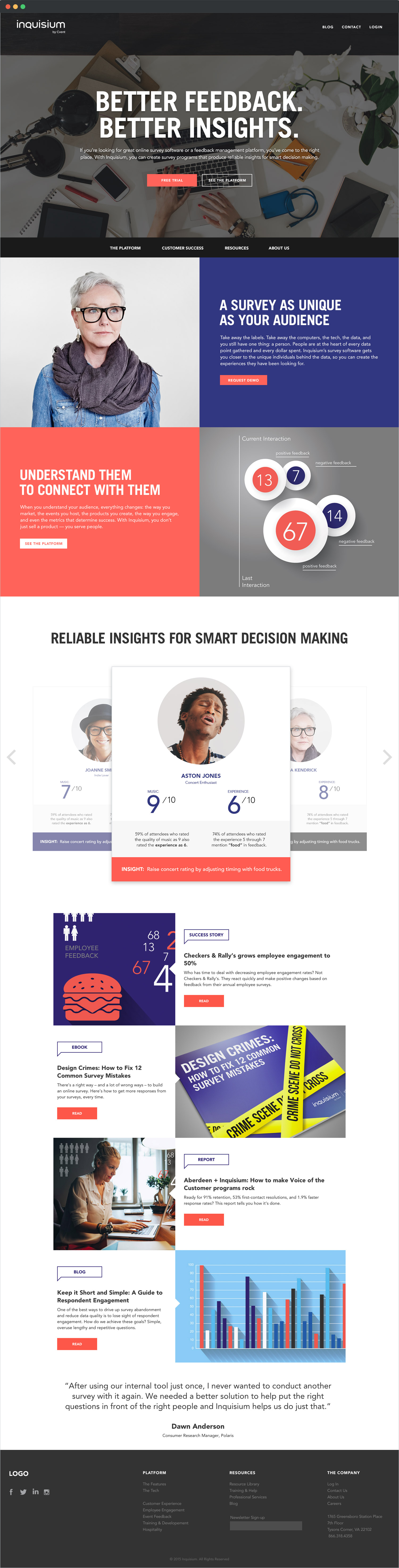 The web survey solutions of Cvent looked to rebrand themselves as a more consumer friendly entity, aiming to connect data & analytics to their users to glean deeper insight. The Inquisium brand was born and with it a whole new look and feel. As project design lead of the project I helped create the web style guide that was used by the web team as well as designing and developing a responsive website.