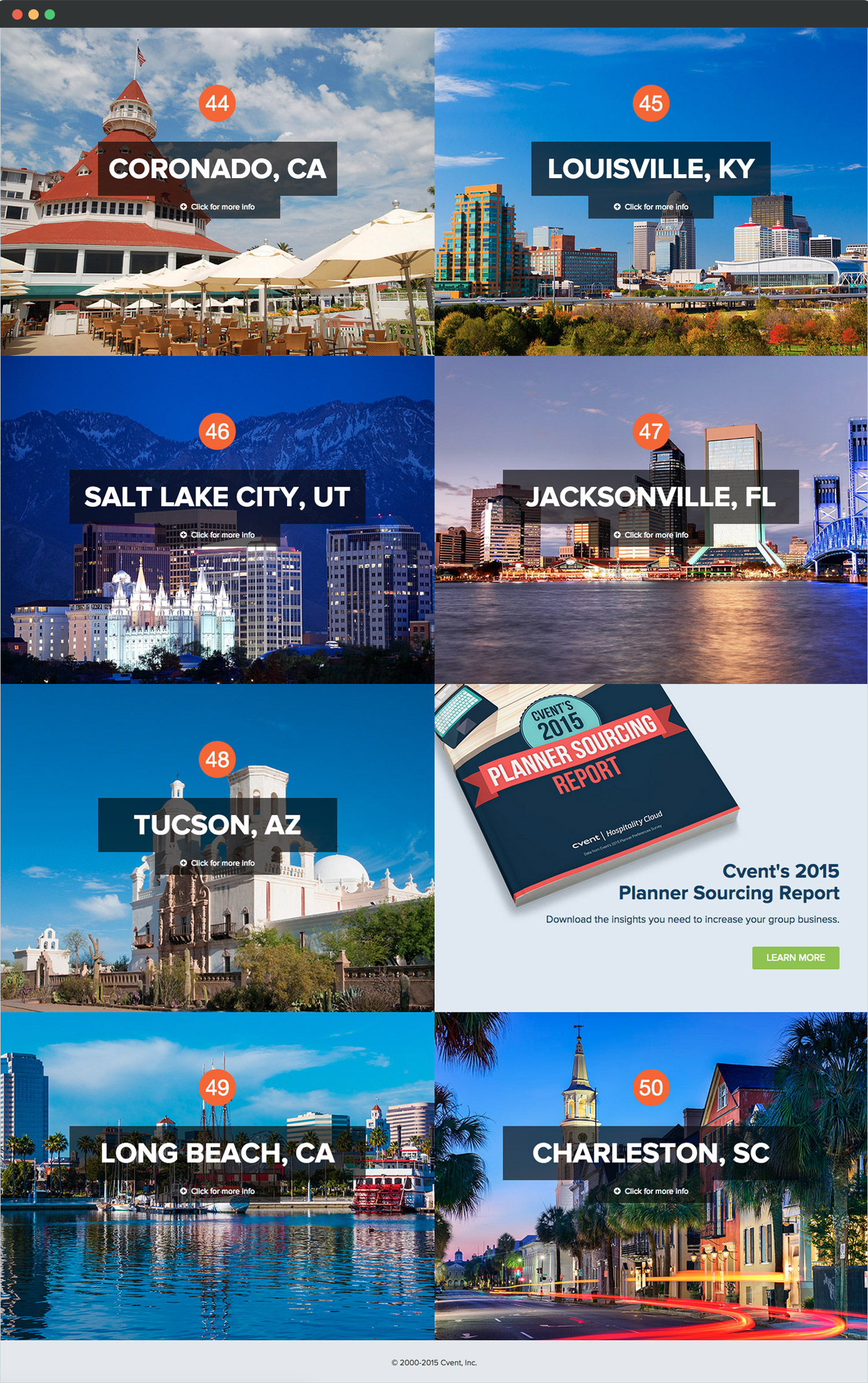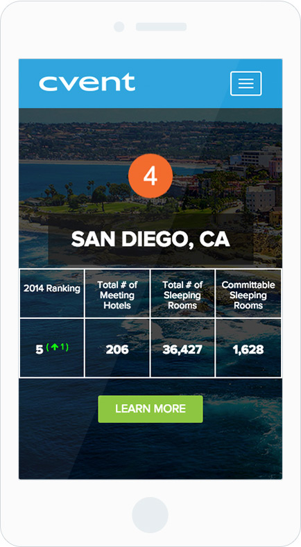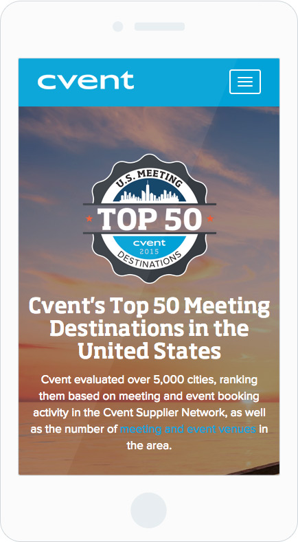 The Cvent Supplier Network produces an annual list of the top 50 cities for meetings and events in the United States. What is usually a static spreadsheet with various cities and statistics, they wanted to create a more visually appealing and interactive design for 2015. Using large and vibrant photographs of each city with minimal text, I was able to achieve a more visually exciting design which successfully increased on-click engagement with users.